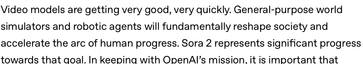 But OpenAI isn’t in the social-media business. They don’t have a social division or a strategy team chasing engagement metrics. Look closely at the Sora 2 page on OpenAI.com and they barely mention the word “social.” They repeatedly call Sora 2 a “general-purpose world simulator” and reference “robotic agents.”
